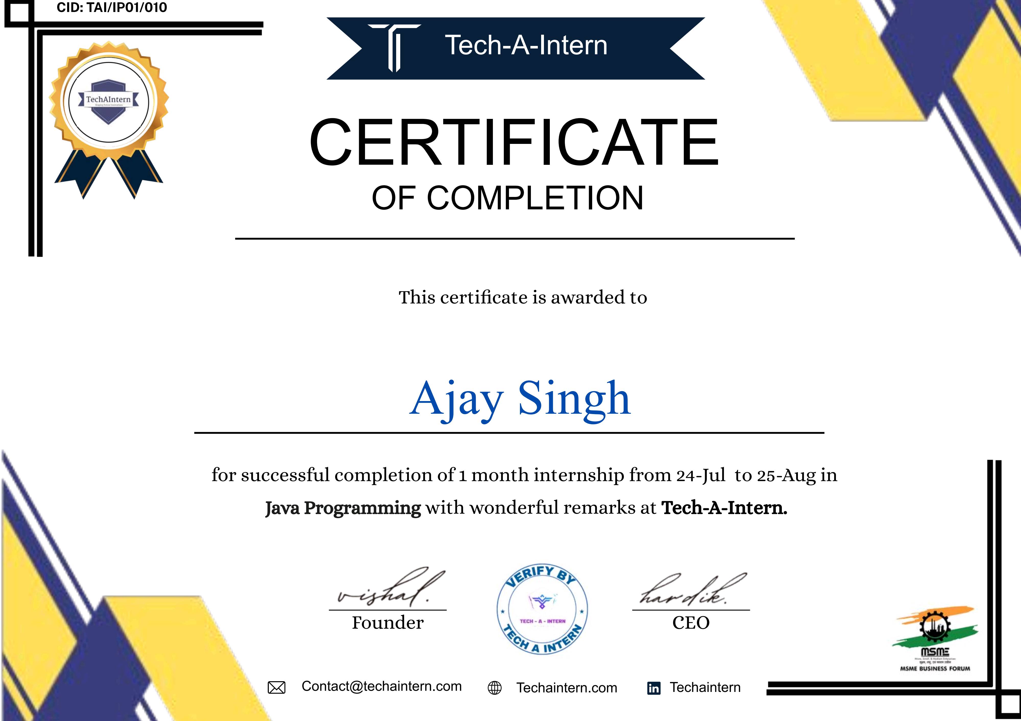 One Month Virtual internship in Java Programming domain under the Tech-A-Intern Company. They assined us various projects to get knowledge of java development.